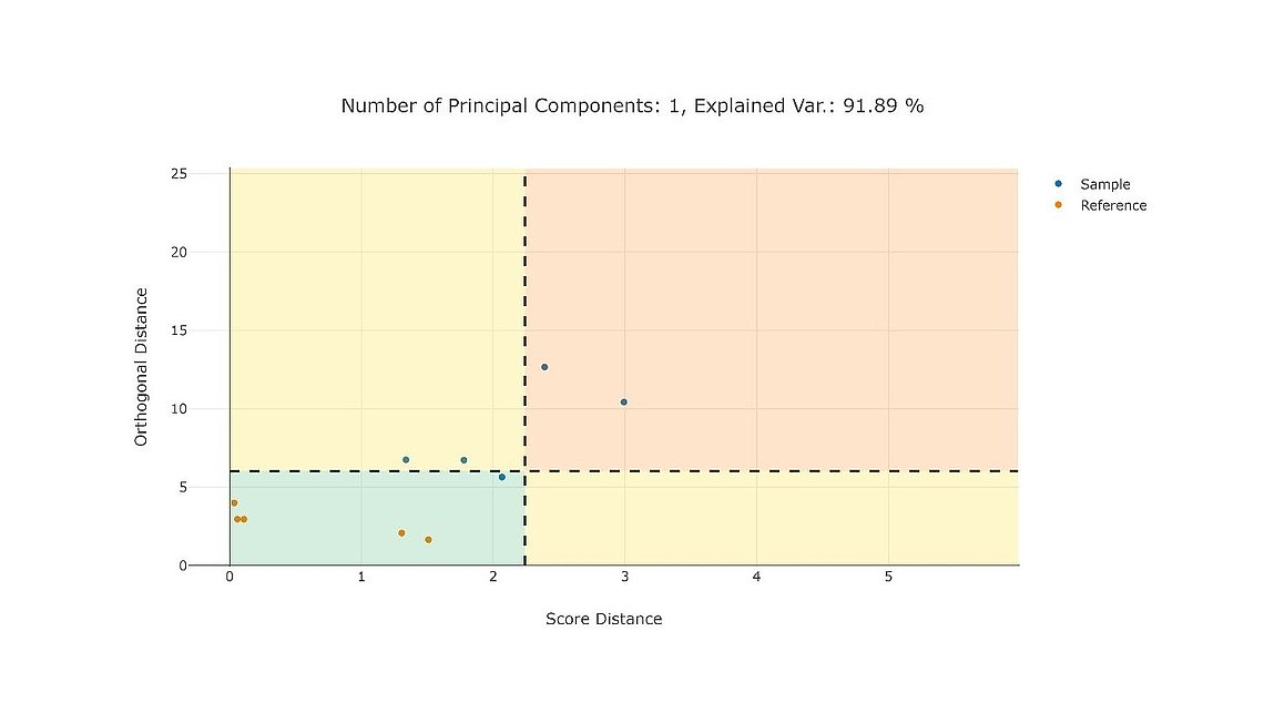 This method for dimension reduction enables the visualization of multi-dimensional data in simple plots. Manufacturing campaigns can be compared based on multiple scalar features (e.g. process parameters and quality attributes). Multiple two-dimensional plots can be created. They differ in the chosen y- and x-axis. If principal components are chosen as axes (biplot), the plot allows to reveal clusters within a group of manufacturing campaigns. Another alternative is to choose the score distance and the orthogonal distance of the individual campaigns to the model as axes. This allows to identify outlying campaigns in a multivariate space.