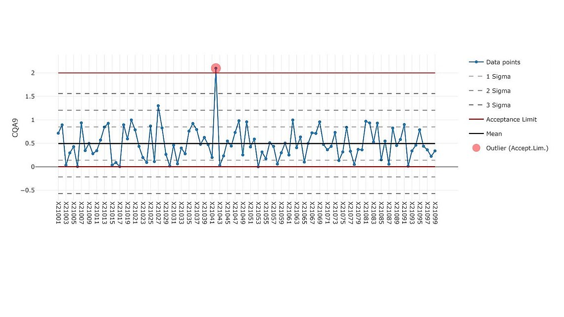 Numerical features are plotted as line in consecutive order. Applied in e.g. CPV trending for assessment of process robustness and identification of trends.