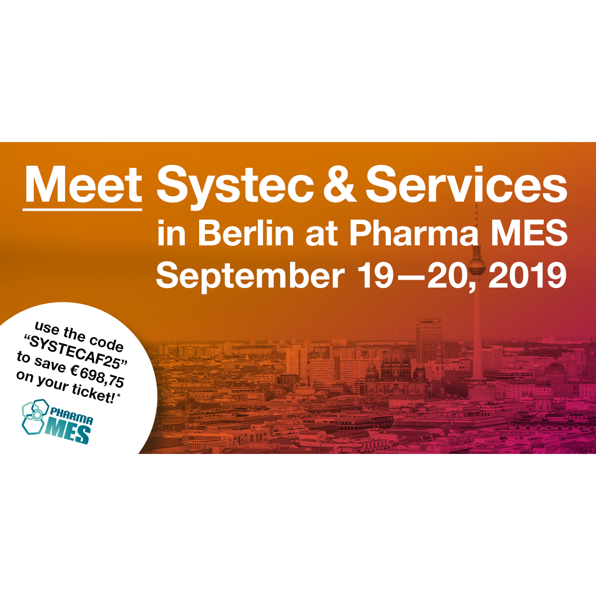 We are pleased to invite you to the Pharma MES 2019—a platform for the exchange of knowledge for the development and use of manufacturing execution systems in the pharmaceutical, biotech and life science industries on September 19—20 in Berlin.