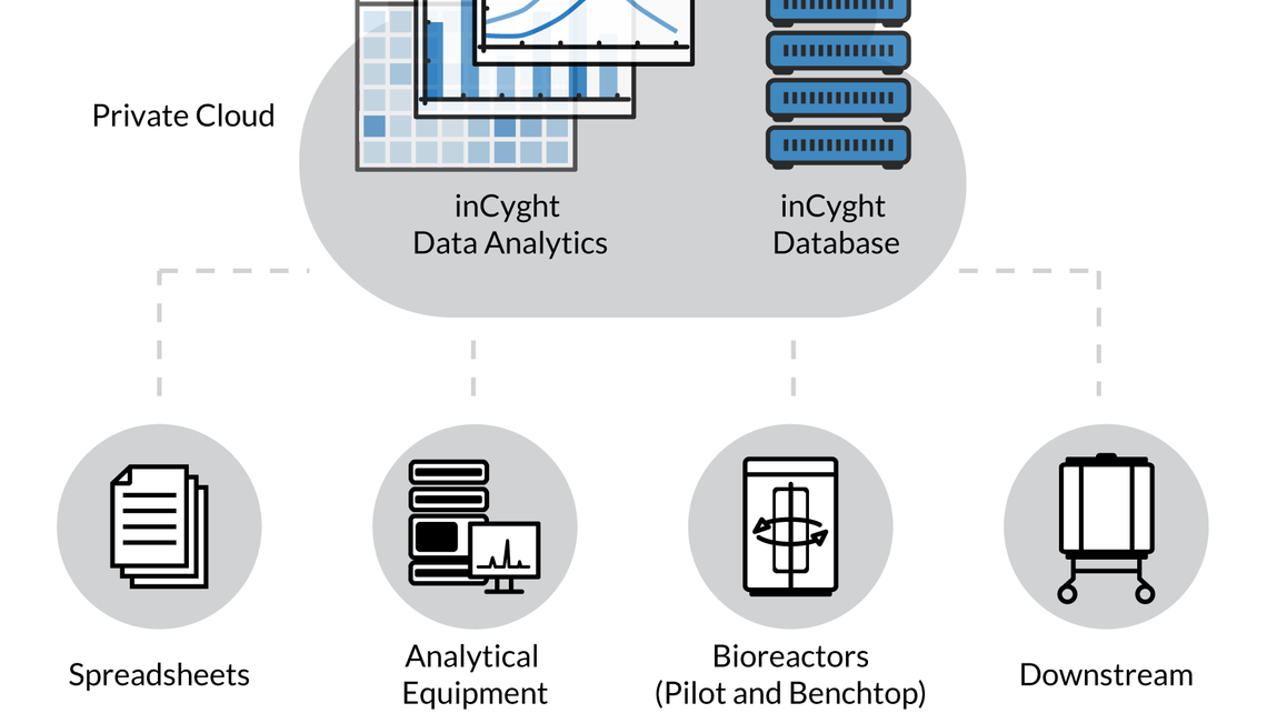 • All data from upstream and downstream processes, bioreactors, spreadsheets, and analytical equipment is stored in a central database.