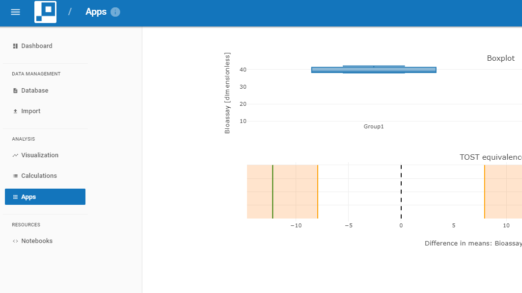 [Translate to English:] Figure 1: Data analytics using the browser-based PAS-X Savvy platform. An example of equivalence testing is used to evaluate biopharma tech-transfers and scale-ups of upstream and downstream processes.