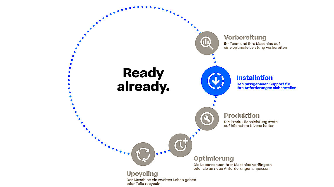 Unsere Services beginnen mit der professionellen Aufstellung der Maschine gemäß den spezifischen Anforderungen Ihrer Anlage und den technischen Vorgaben. Wir kümmern uns um den fachgerechten Anschluss an die bauseitige Medienversorgung, wie Strom und Druckluft, um eine sofortige Betriebsbereitschaft zu gewährleisten. Anschließend führen unsere Spezialisten erste Testläufe durch, um die grundlegende Funktionalität der Maschine zu überprüfen.
