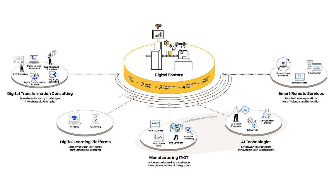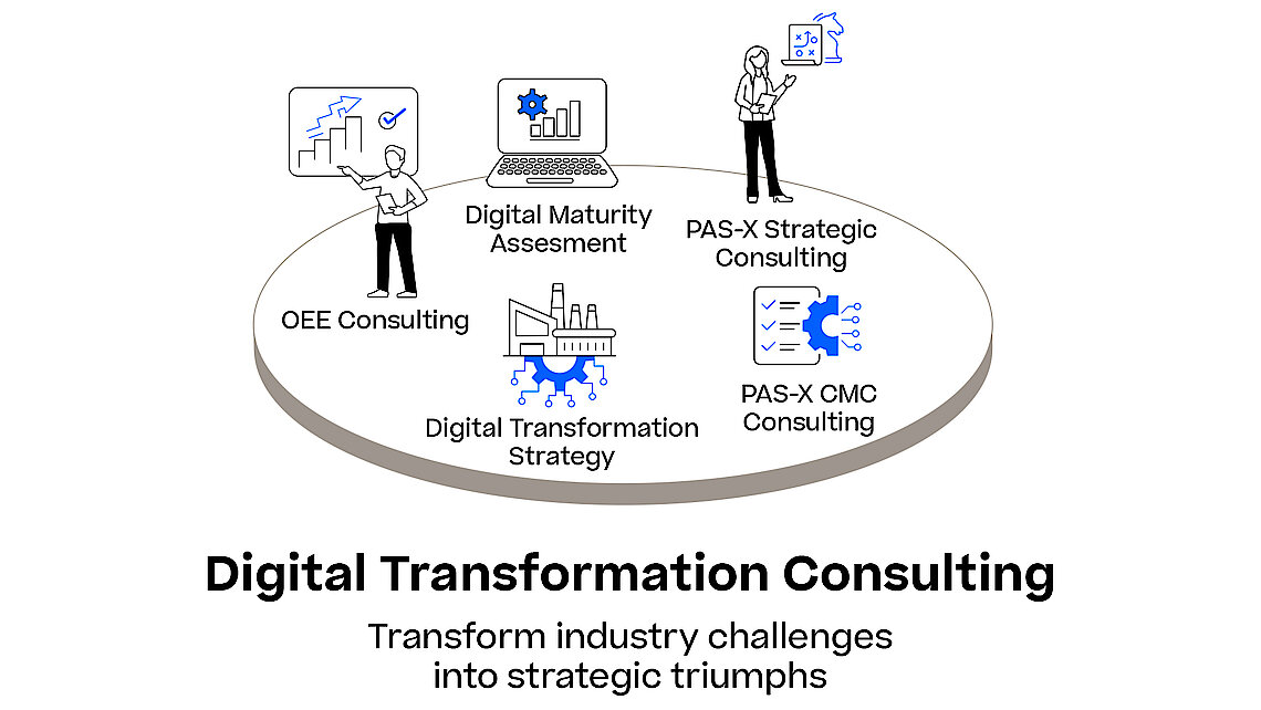 Legen Sie die Ziele und Strategien für Ihre Fertigungs-IT fest und nutzen dabei das Potenzial unserer Werum PAS-X MES-Lösung. Mit uns haben Sie auf Ihrem Weg zur Digitalisierung von Anfang an einen kompetenten Partner mit umfassender Branchenkenntnis an Ihrer Seite. Wir beraten Sie und führen Sie durch den kompletten Digitalisierungsprozess: vom Beginn der digitalen strategischen Analyse- und Definitionsphase über die Projekt-/Programmausführung bis zu konkreten Optimierungspotenzialen im operativen Geschäft sowie bei der Qualitätssicherung, Compliance und Operational Excellence.